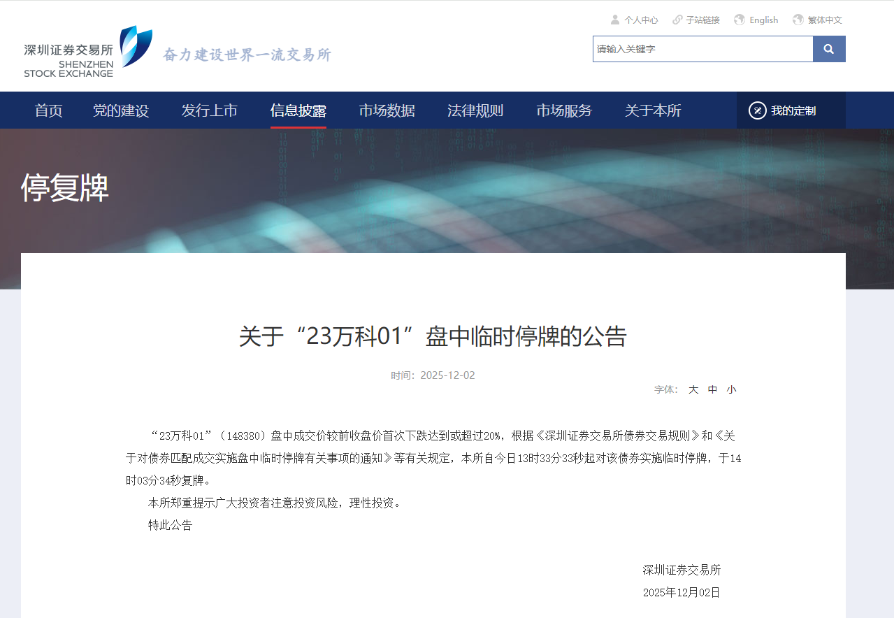 深交所:“23万科01”盘中临时停牌