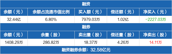 融资方面,当日融资买入7979.03万元,融资偿还1.02亿元,融资净偿还2227.03万元,连续7日净偿还累计1.46亿元。融券方面,融券卖出18.37万股,融券偿还4.26万股,融券余量286.82万股,融券余额1408.29万元。融资融券余额合计32.58亿元。