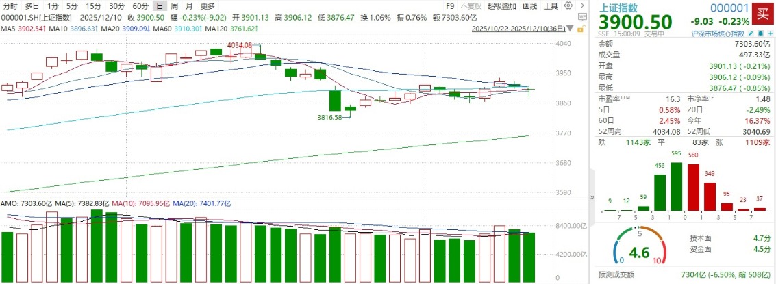 12月10日,上证指数小幅低开后快速走低,午后在探出日内低点后开始震荡反弹,但盘中始终未能翻红,5日与20日均线对指数压制明显。最终收盘出现小幅回调,勉强收复3900点整数关口。