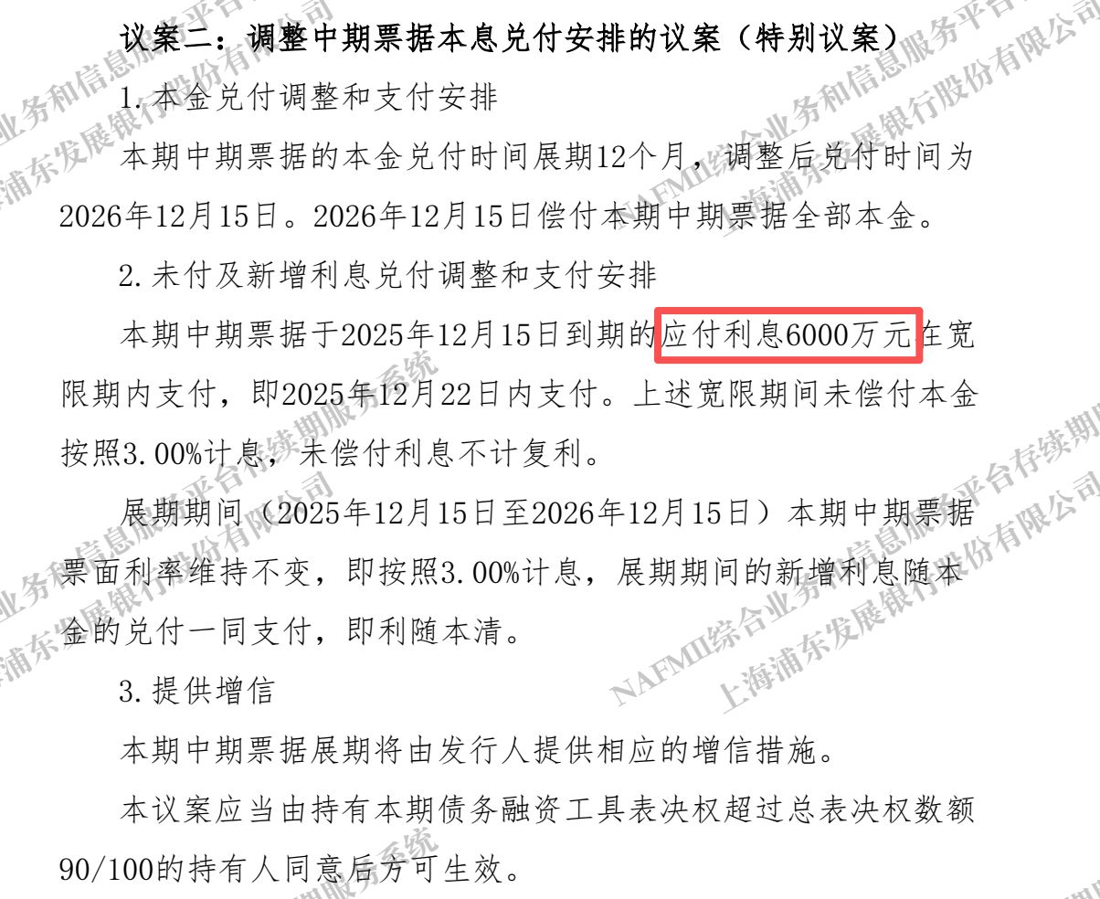 议案二即本息兑付安排,本金兑付时间仍然展期一年,但新增了利息兑付安排。本期中期票据于2025年12月15日到期的应付利息6000万元在宽限期内支付,即2025年12月22日内支付。上述宽限期间未偿付本金按照3.00%计息,未偿付利息不计复利。