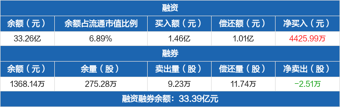 融资方面,当日融资买入1.46亿元,融资偿还1.01亿元,融资净买入4425.99万元。融券方面,融券卖出9.23万股,融券偿还11.74万股,融券余量275.28万股,融券余额1368.14万元。融资融券余额合计33.39亿元。