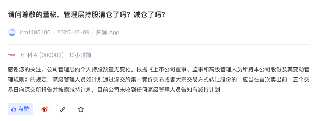 12月18日,据深交所互动易消息,针对投资者提出的管理层持股是否有变动的问题,万科企业股份有限公司(万科A,000002.SZ)回应称,“公司管理层的个人持股数量无变化。”根据《上市公司董事、监事和高级管理人员所持本公司股份及其变动管理规则》的规定,高级管理人员如计划通过深交所集中竞价交易或者大宗交易方式转让股份的,应当在首次卖出前十五个交易日向深交所报告并披露减持计划,目前公司未收到任何高级管理人员告知有减持计划。
