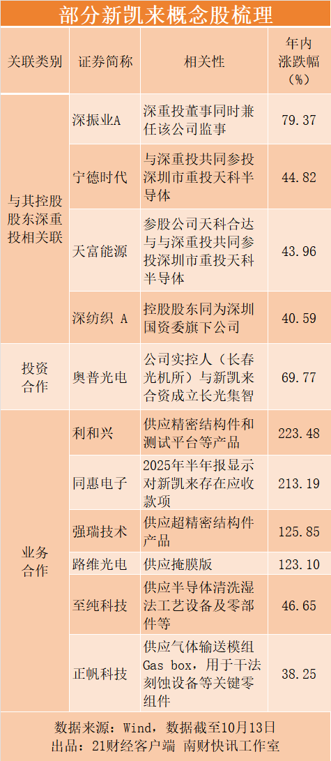 此外,奥普光电、同惠电子、利和兴等多家与新凯来存在投资或业务合作的公司均股价高涨。而在10月10日、13日两连板的新莱应材、凯美特气,虽也被市场视为新凯来概念股,但截至目前两家公司均尚未正面肯定相关合作。其中,凯美特气在8月28日回应投资者称,截至目前公司与新凯来尚未开展合作。新莱应材则表示,公司的具体客户信息属于商业机密。