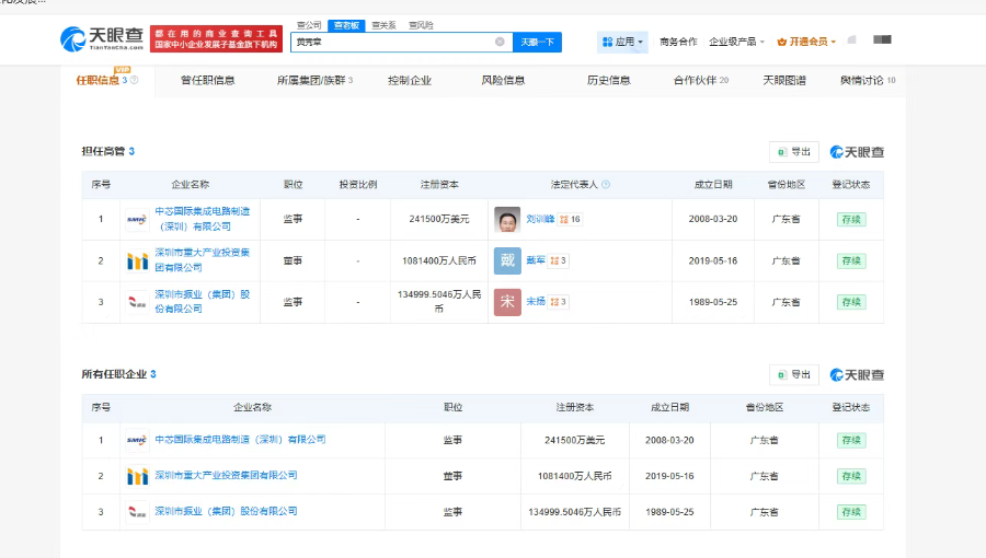 因两家公司存在高管关联,深振业A被视为新凯来概念股。天眼查信息显示,新凯来的实际控股股东深圳市重大产业投资集团有限公司,其董事黄秀章同时兼任深振业的监事。此外,黄秀章还同时兼任中芯国际的监事。
