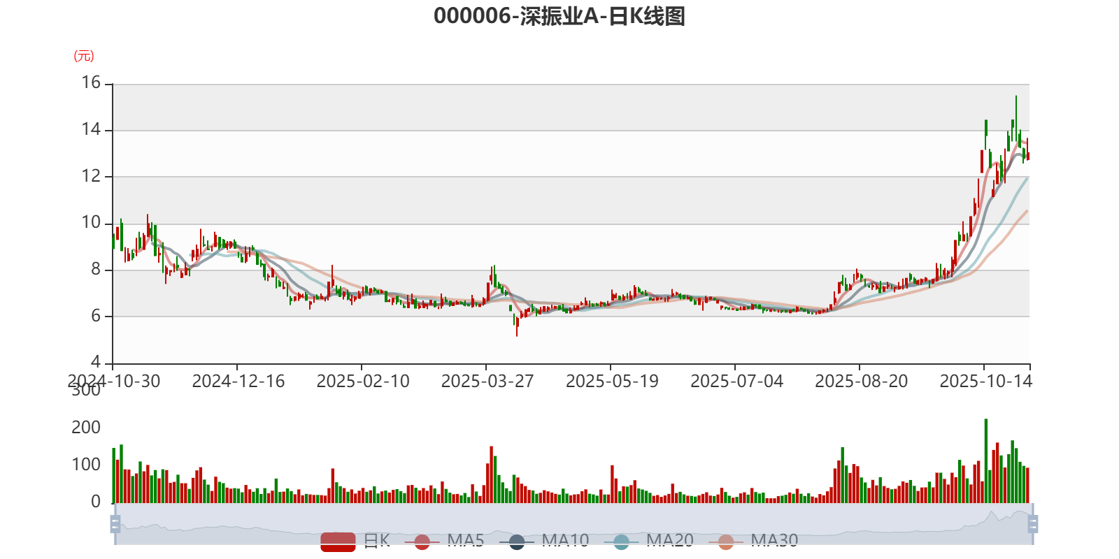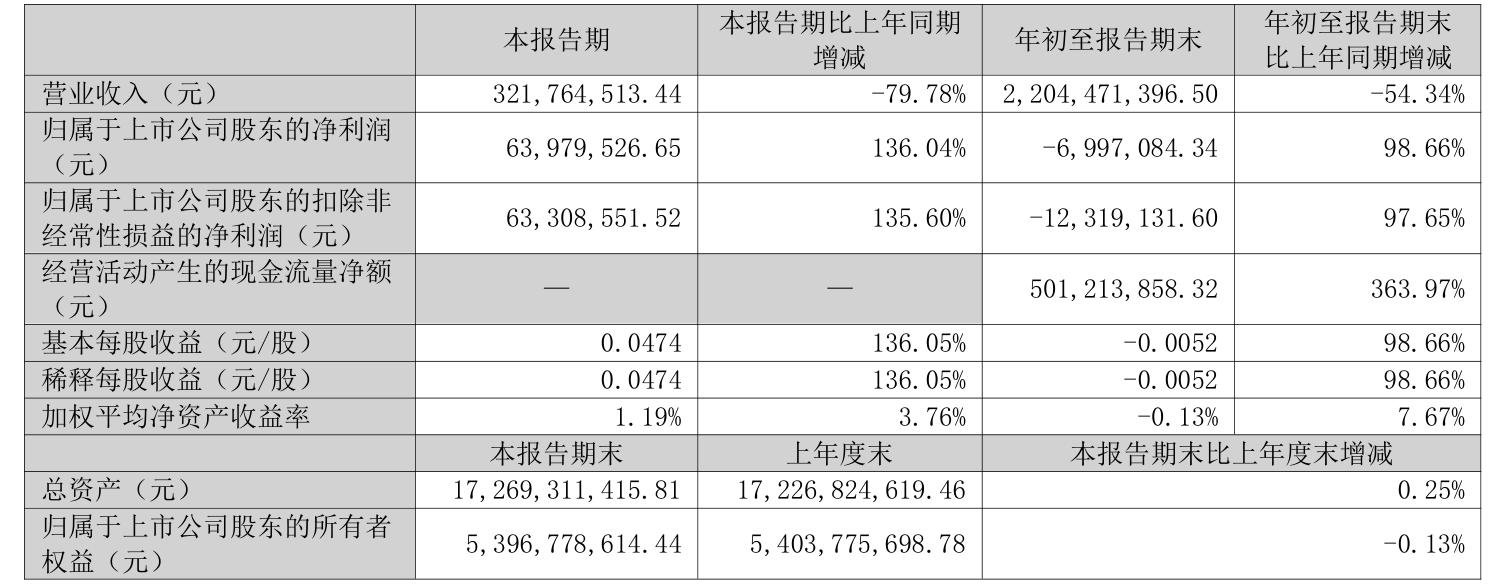 中证智能财讯深振业A(000006)10月30日披露2025年第三季度报告。前三季度公司实现营业总收入22.04亿元,同比下降54.34%;归母净利润亏损699.71万元,上年同期亏损5.24亿元;扣非净利润亏损1231.91万元,上年同期亏损5.25亿元;经营活动产生的现金流量净额为5.01亿元,同比增长363.97%;报告期内,深振业A基本每股收益为-0.0052元,加权平均净资产收益率为-0.13%。