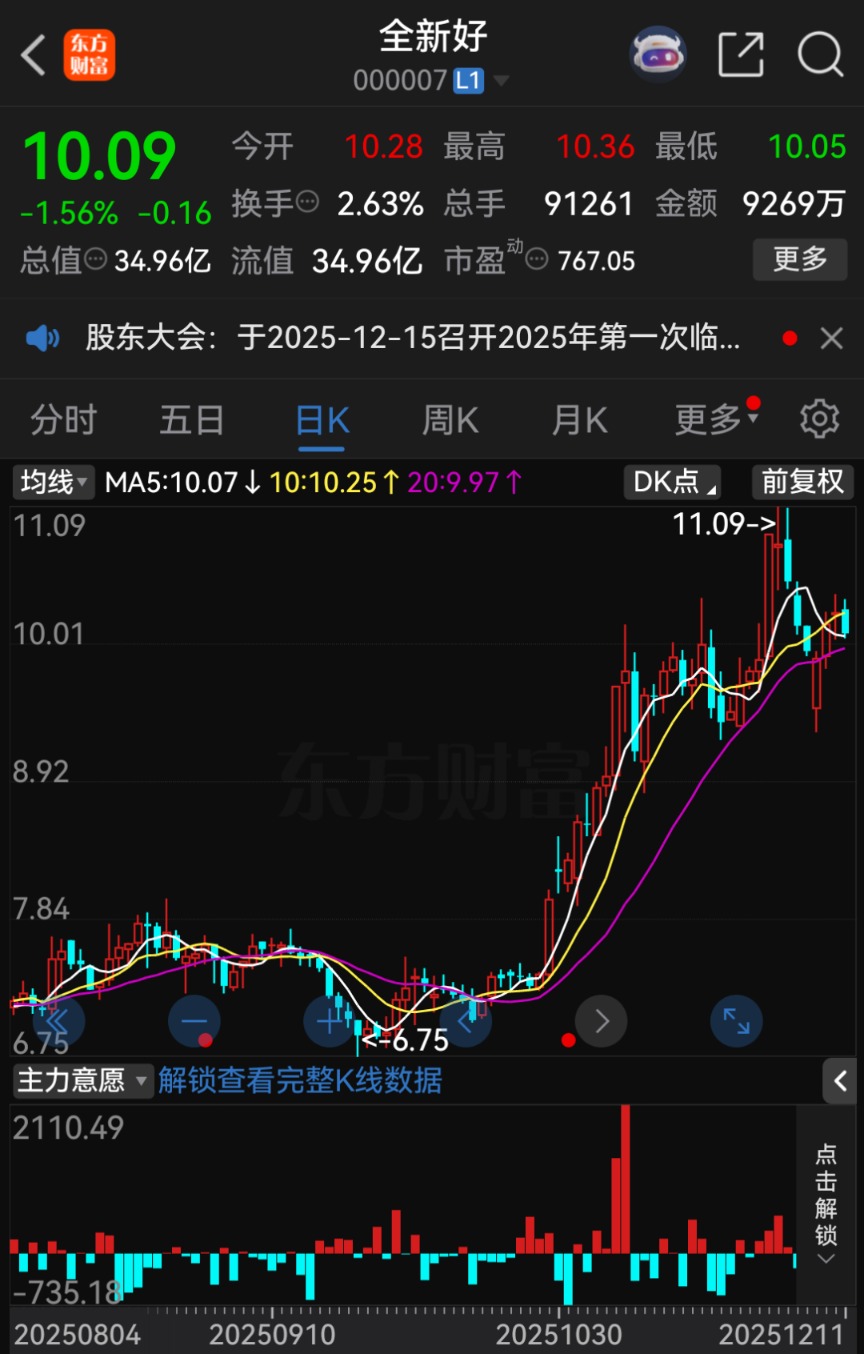 12月11日收盘,全新好股价报10.09元/股,跌幅达1.56%,总市值为34.96亿元。