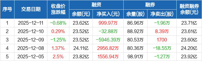 融资方面,当日融资买入2304.89万元,融资偿还1304.92万元,融资净买入999.97万元。融券方面,融券卖出5200股,融券偿还2.48万股,融券余量86.96万股,融券余额888.7万元。融资融券余额合计23.71亿元。