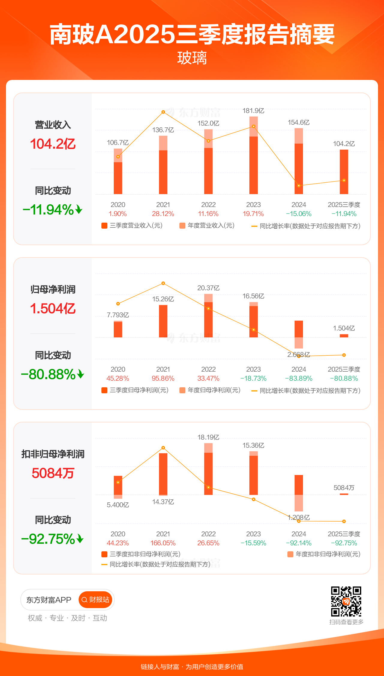 南玻A10月29日发布2025年三季报显示,公司前三季实现营业收入104.24亿元,同比下滑11.94%;归母净利润1.50亿元,同比下滑80.88%;扣非归母净利润5083.65万元,同比下滑92.75%。