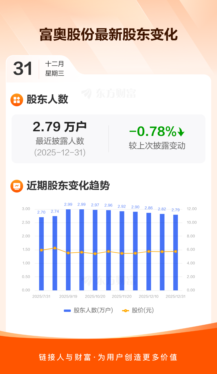 富奥股份最新披露数据显示,截至12月31日公司股东户数为2.79万户,较上期(2025年12月19日)减少219户,降幅为0.78%。户均持有流通股数量由上期的6.11万股上升至6.15万股,户均持股金额由上期的34.86万元增加至35.32万元。