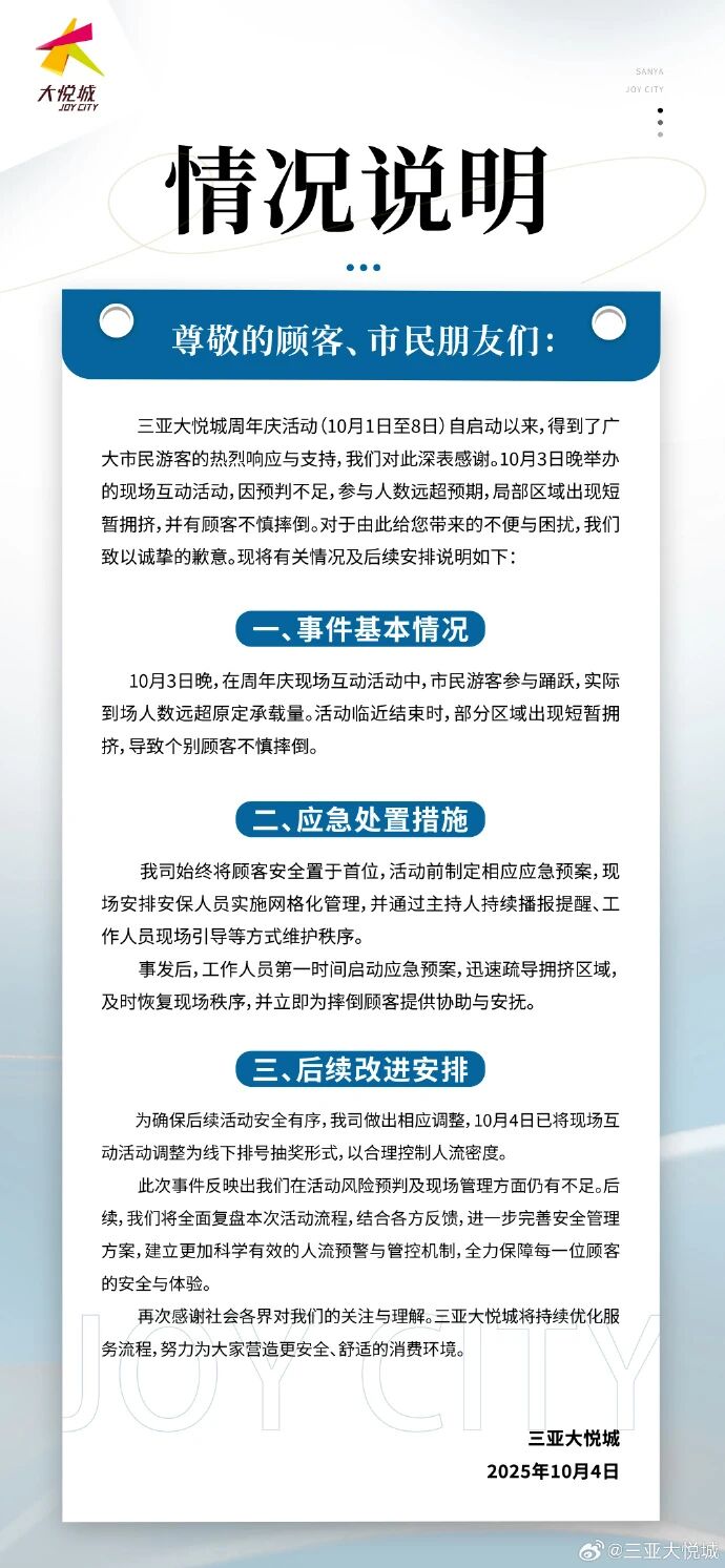 每经AI快讯,10月4日晚10时许,三亚大悦城发布“情况通报”称,3日晚举办的现场互动活动,因预判不足,参与人数远超预期,局部区域出现短时拥挤,并有顾客不慎摔倒。“对于由此给您带来的不便与困扰,我们致以诚挚的歉意。”