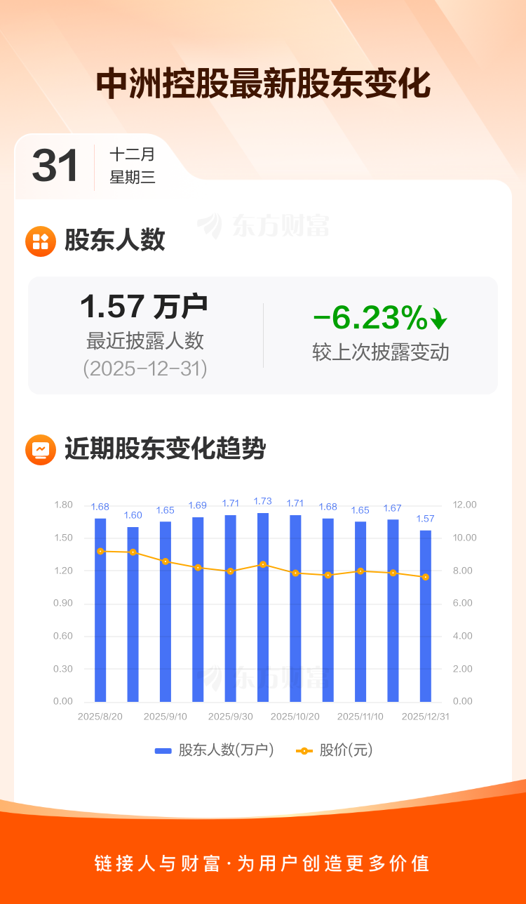中洲控股最新披露数据显示,截至12月31日公司股东户数为1.57万户,较上期(2025年11月20日)减少1042户,降幅为6.23%。户均持有流通股数量由上期的3.97万股上升至4.23万股,户均持股金额由上期的31.24万元增加至32.26万元。