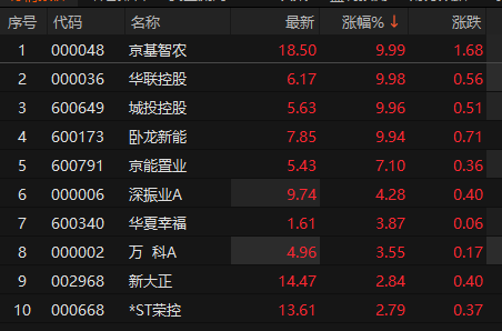 上证报中国证券网讯 1月21日早盘,房地产板块震荡走强,截至9时51分,京基智农、城投控股2连板,华联控股、卧龙新能涨停,京能置业、深振业A、华夏幸福等跟涨。