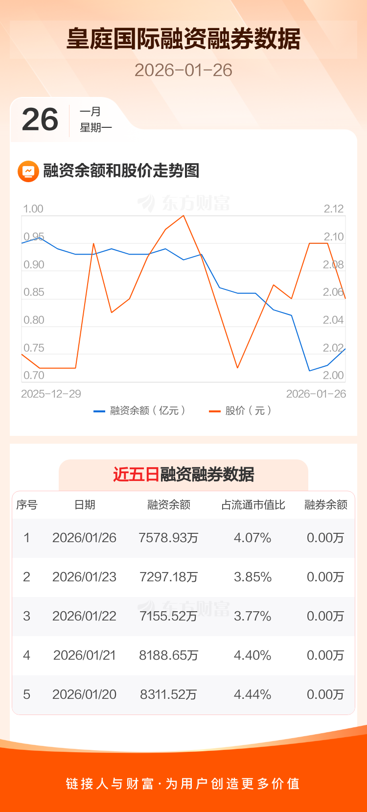 交易所最新数据显示,皇庭国际于2026年1月26日获融资买入406.68万元,融资偿还124.93万元,当日融资净买入281.75万元。目前,该股融资余额7578.93万,占流通市值比例为4.07%。