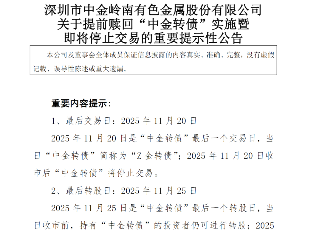 中金岭南发布关于提前赎回“中金转债”实施暨即将停止交易的重要提示性公告,提醒投资者11月20日为中金转债最后一个交易日,11月25日是最后一个转股日,债券持有人应及时卖出或转股。11月25日收市后,未实施转股的中金转债将全部冻结,停止交易和转股。
