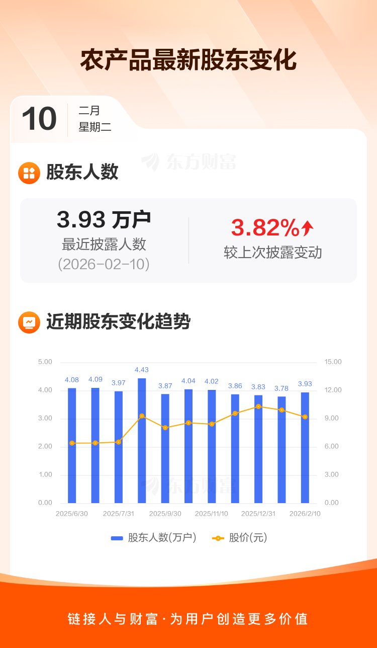 农产品最新披露数据显示,截至2月10日公司股东户数为3.93万户,较上期(2026年1月20日)增加1446户,增幅为3.82%。户均持有流通股数量由上期的4.49万股下降至4.32万股,户均持股金额由上期的44.47万元减少至39.63万元。