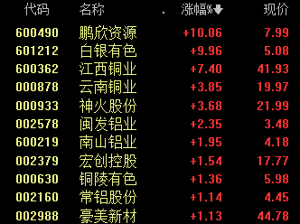 工业金属板块部分个股早盘延续强势,鹏欣资源、白银有色涨停,江西铜业涨超7%,云南铜业、神火股份、闽发铝业等跟涨。
