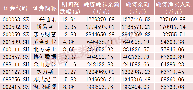 从个股情况来看,上周融资客对138只股票加仓金额超1亿元,加仓居前的10只股票分别为中兴通讯、新易盛、东方财富、紫金矿业、北方稀土、协创数据、金山办公、赛力斯、寒武纪-U、海康威视,分别净买入20.72亿元、17.09亿元、13.28亿元、9.46亿元、7.79亿元、6.76亿元、6.43亿元、6.37亿元、5.93亿元、5.58亿元。从市场表现上看,上周融资客加仓居前十的股票跌多涨少,涨幅最大的中兴通讯涨逾13%。