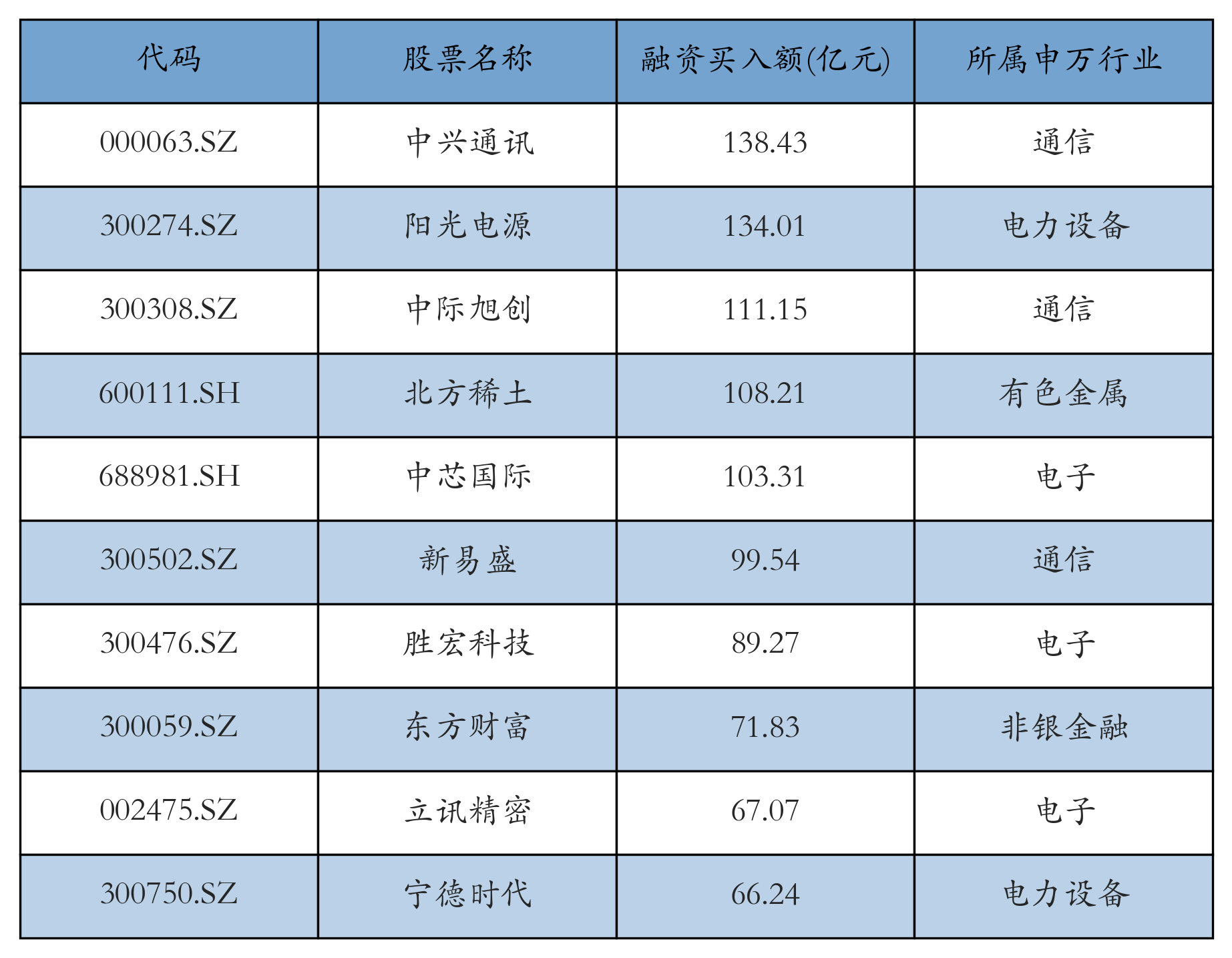 上周两市共有3450只个股有融资资金买入,共有210只个股买入金额超10亿元,其中中兴通讯、阳光电源、中际旭创排名前三,买入金额分别138.43亿元、134.01亿元、111.15亿元。融资买入额前10个股详情见下表:
