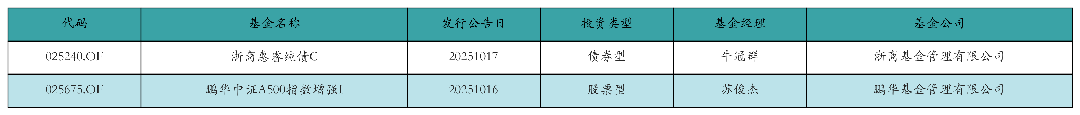 上周有2只新基金发行,分别为:浙商惠睿纯债C、鹏华中证A500指数增强I,详情见下表: