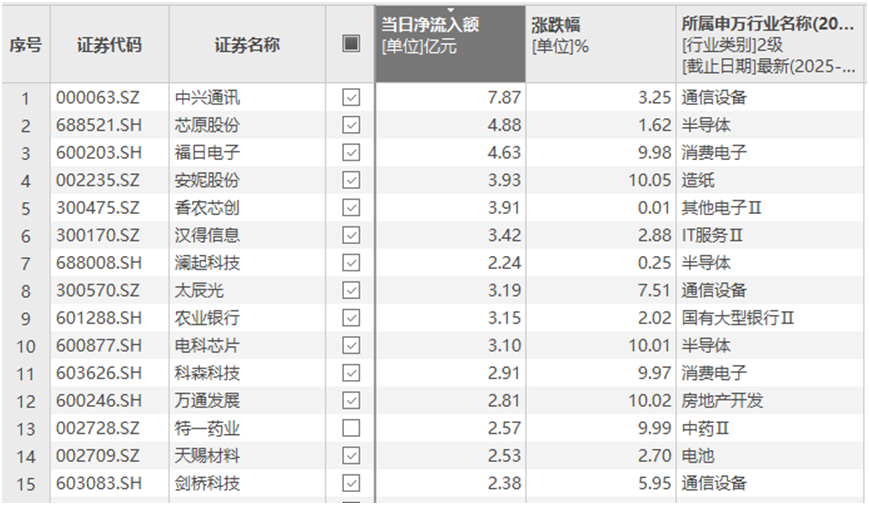 上证报中国证券网讯(记者徐蔚)Choice数据显示,11月27日,当日资金净流入额排名前个股包括中兴通讯、芯原股份、福日电子、安妮股份、香农芯创、汉得信息、太辰光、农业银行、电科芯片等,净流入额均超3亿元。其中,芯原股份、福日电子、电科芯片等属于半导体或消费电子板块。