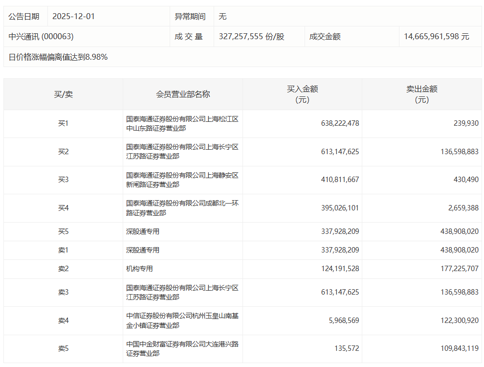中兴通讯今日涨停 国泰海通上海中山东路大额买入