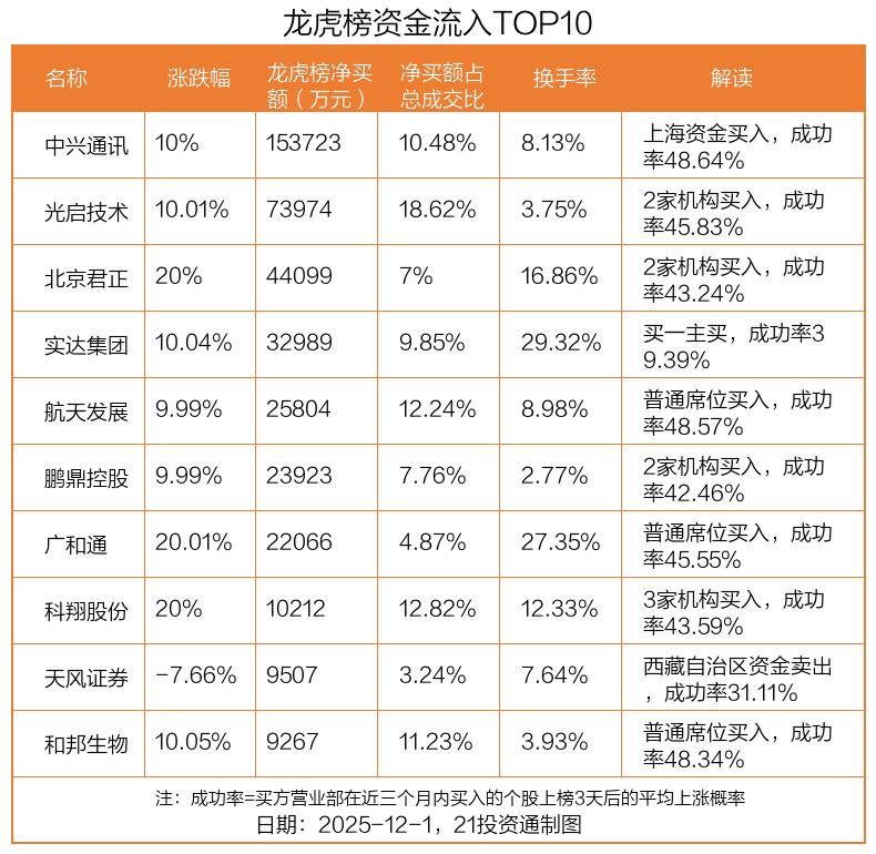 12月1日,上证指数上涨0.65%,深证成指上涨1.25%,创业板指上涨1.31%。盘后龙虎榜数据显示,共有47只个股因当日异动登上龙虎榜,资金净流入最多的是中兴通讯(000063.SZ),达15.37亿元。