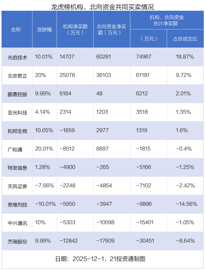 值得注意的是,机构和北向资金共同净买入了光启技术、北京君正、亚光科技、鹏鼎控股等4股;共同净卖出了特发信息、思维列控、天风证券、中兴通讯、杰瑞股份等5股;在广和通、和邦生物上出现分歧,机构净卖出广和通8512万元,北向资金净买入6697.06万元;机构净卖出和邦生物1658.59万元,北向资金净买入2977.1万元。