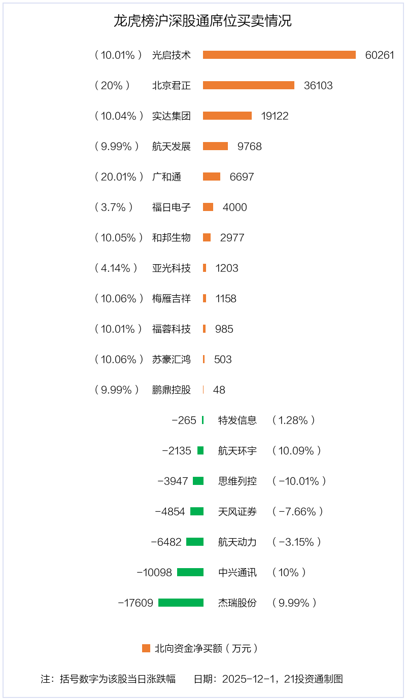 12月1日,北向资金参与龙虎榜中的个股共有19只,合计净买入9.74亿元。其中沪股通净买入6股,净卖出4股,合计净买入1.13亿元;深股通净买入6股,净卖出3股,合计净买入8.61亿元。