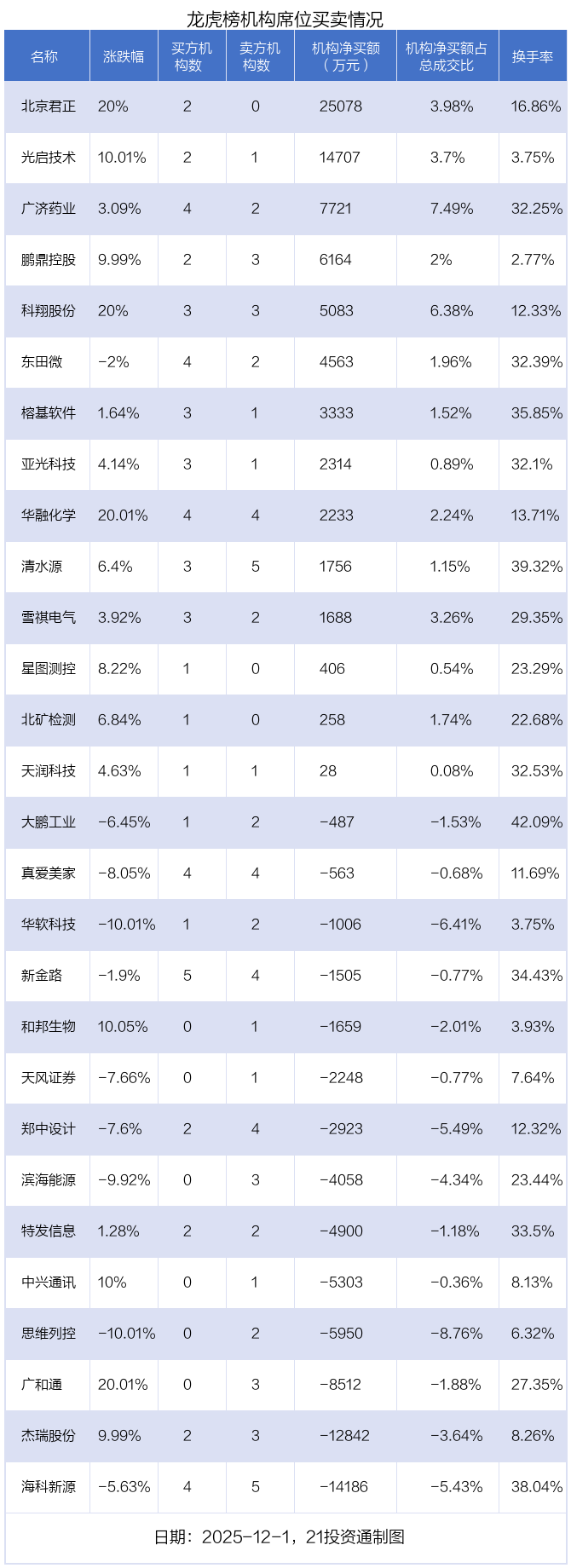 12月1日,28只个股龙虎榜出现了机构的身影,机构合计净买入9190.09万元。具体来看,机构净买入14股,净卖出14股。
