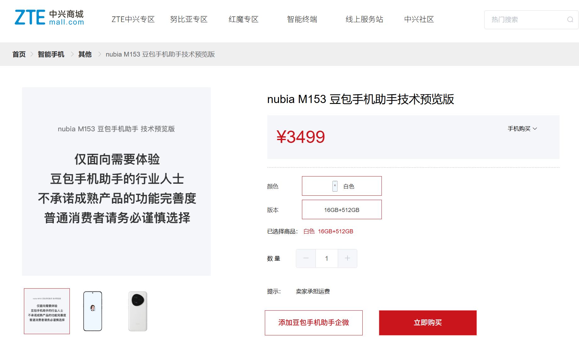 12月1日,字节跳动旗下AI助手豆包和中兴通讯先后宣布,搭载豆包手机助手技术预览版的工程样机nubia(努比亚) M153少量发售。目前该机型在中兴商城售卖,仅有16GB+512GB一款配置,售价为3499元。