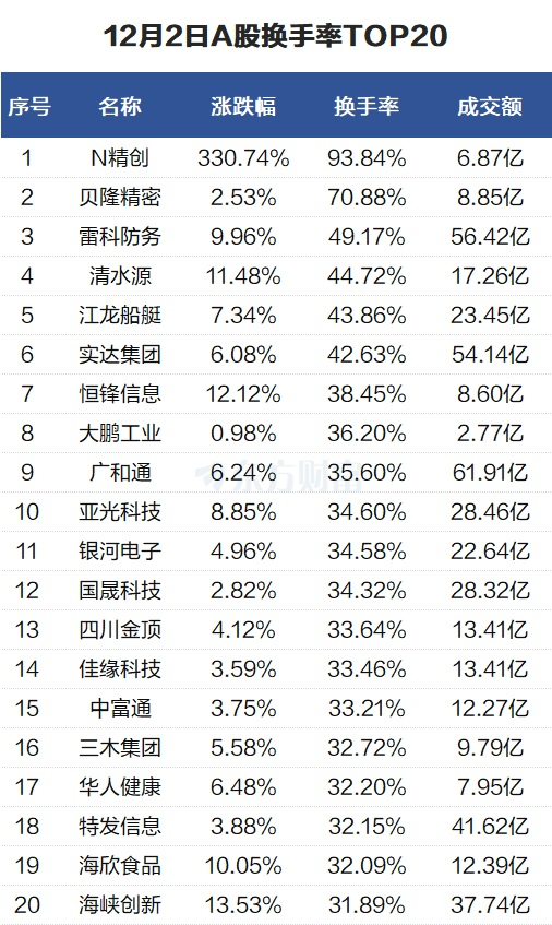 当天换手率最高的个股为N精创,全天换手率93.84%。贝隆精密紧随其后,全天换手率70.88%。