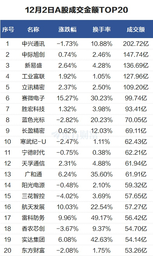 沪深两市成交额1.59万亿元,较上一交易日缩量2805亿元。个股方面,中兴通讯当日成交202.72亿元。中际旭创当日成交147.74亿元。