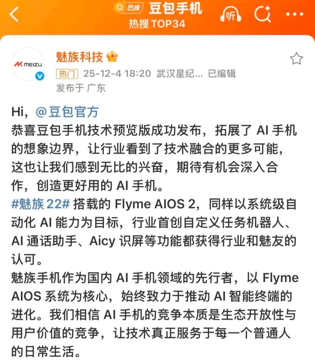 移动终端生态开战!魅族公开喊话豆包:有机会合作!