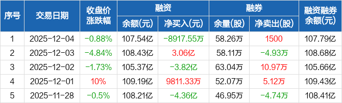 中兴通讯:融资净偿还8917.55万元,两市排名第17(12-04)