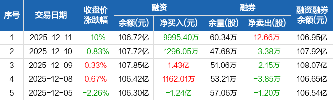 中兴通讯:融资净偿还9995.4万元,融资余额106.72亿元(12-11)