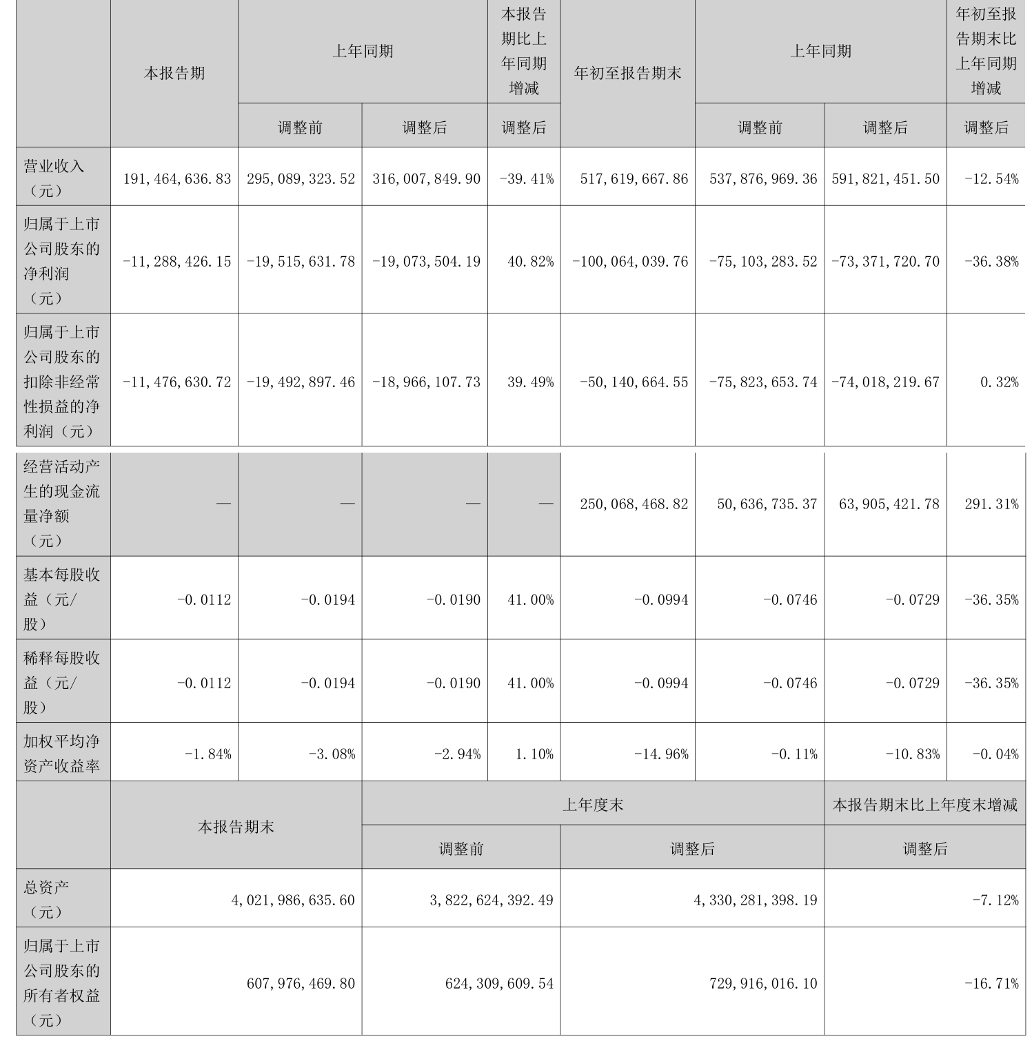 中证智能财讯华控赛格(000068)10月30日披露2025年第三季度报告。前三季度公司实现营业总收入5.18亿元,同比下降12.54%;归母净利润亏损1亿元,上年同期亏损7337.17万元;扣非净利润亏损5014.07万元,上年同期亏损7401.82万元;经营活动产生的现金流量净额为2.5亿元,同比增长291.31%;报告期内,华控赛格基本每股收益为-0.0994元,加权平均净资产收益率为-14.96%。