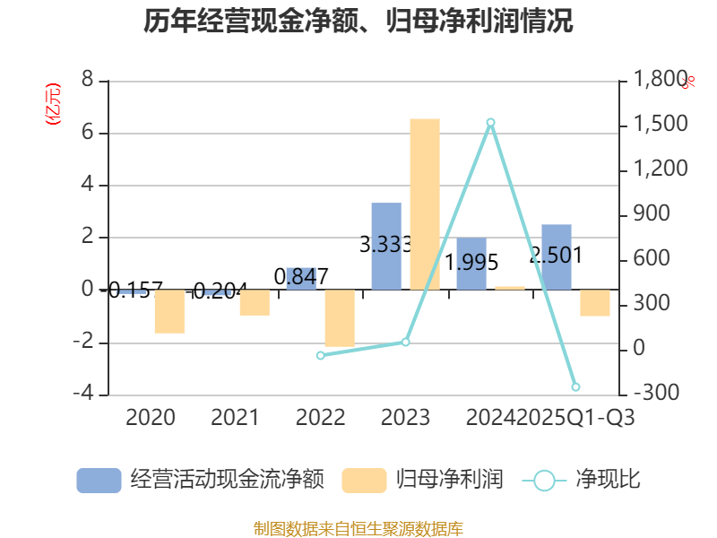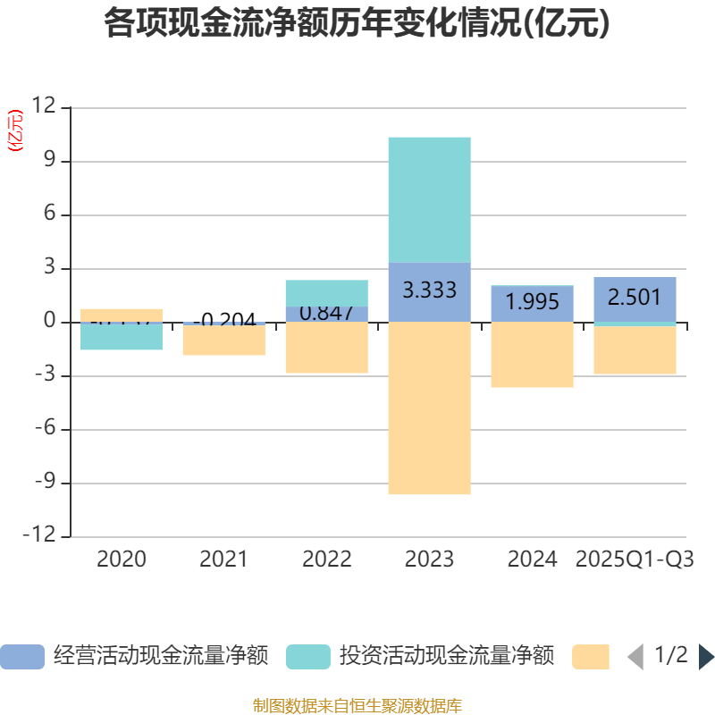 2025年前三季度,公司经营活动现金流净额为2.5亿元,同比增长291.31%;筹资活动现金流净额-2.66亿元,同比增加3770.02万元;投资活动现金流净额-2672.55万元,上年同期为-1100.9万元。