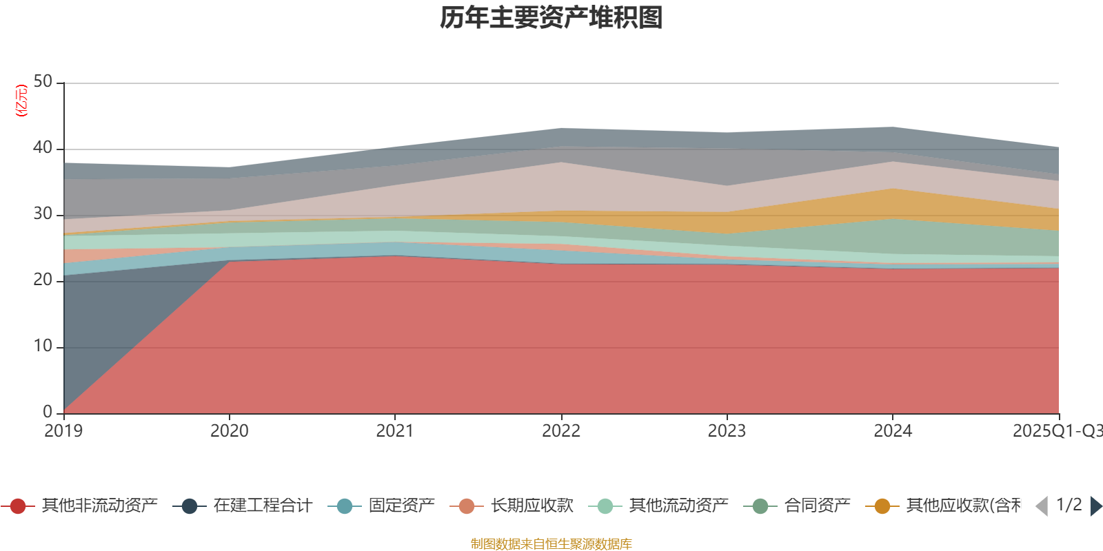 资产重大变化方面,截至2025年三季度末,公司其他非流动资产较上年末增加0.66%,占公司总资产比重上升4.21个百分点;合同资产较上年末减少27.36%,占公司总资产比重下降2.67个百分点;其他应收款(含利息和股利)较上年末减少27.88%,占公司总资产比重下降2.38个百分点;应收票据及应收账款较上年末增加3.68%,占公司总资产比重上升1.09个百分点。