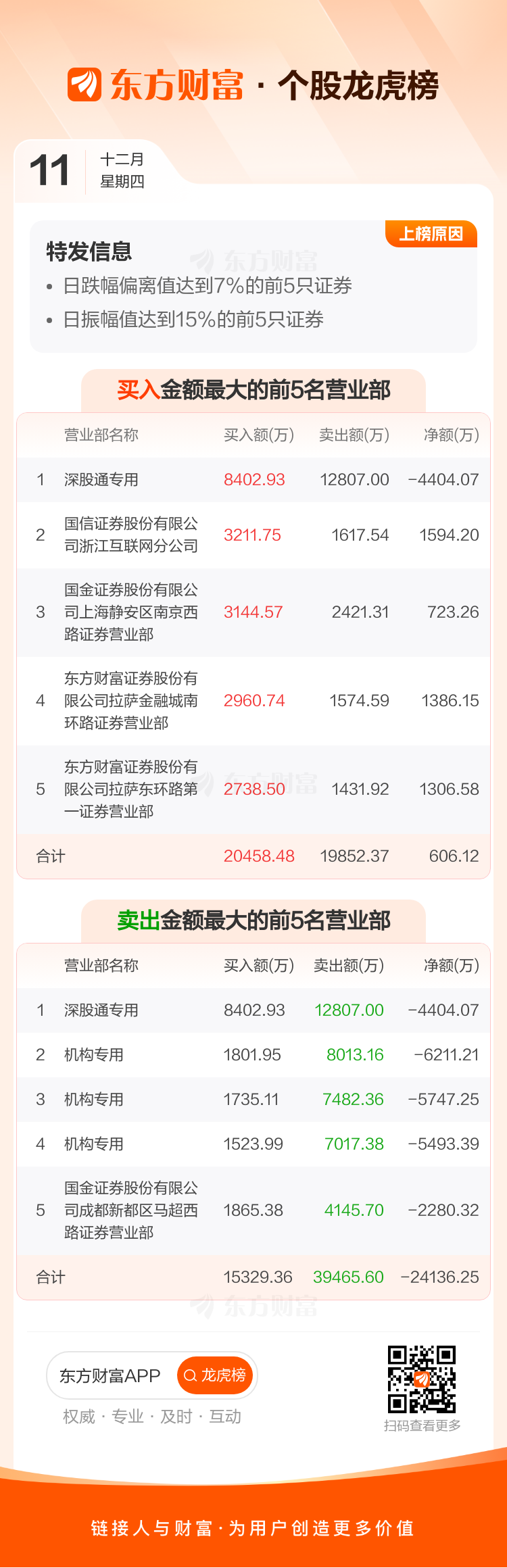 交易所2025年12月11日公布的交易公开信息显示,特发信息因成为日跌幅偏离值达到7%的前5只证券、日振幅值达到15%的前5只证券上榜。特发信息当日收报13.37元,涨跌幅-9.97%,偏离值-8.59%,换手率27.38%,成交额34.64亿。