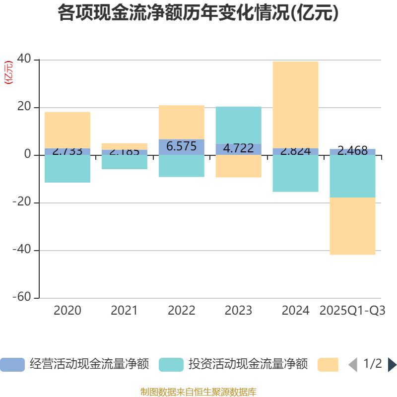2025年前三季度,公司经营活动现金流净额为2.47亿元,同比下降25.67%;筹资活动现金流净额-24.03亿元,同比减少20.78亿元;投资活动现金流净额-17.92亿元,上年同期为6.61亿元。