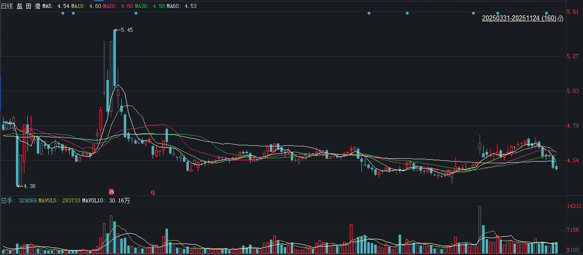 二级市场上,截至11月24日收盘,盐田港下跌0.22%报4.48元/股,总市值约232.94亿元,今年来公司股价累计下跌约5%。