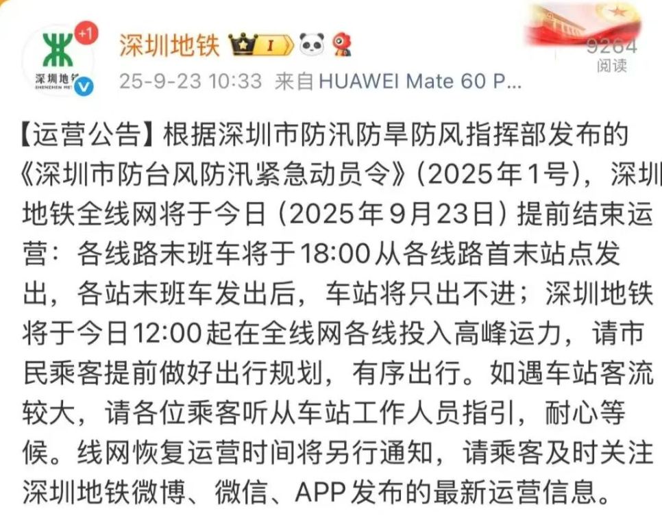9月23日,深圳地铁发布运营公告:根据深圳市防汛防旱防风指挥部发布的《深圳市防台风防汛紧急动员令》(2025年1号),深圳地铁全线网将于今日(2025年9月23日)提前结束运营:各线路末班车将于18:00从各线路首末站点发出,各站末班车发出后,车站将只出不进;深圳地铁将于今日12:00起在全线网各线投入高峰运力,请市民乘客提前做好出行规划,有序出行。如遇车站客流较大,请各位乘客听从车站工作人员指引,耐心等候。线网恢复运营时间将另行通知,请乘客及时关注深圳地铁微博、微信、APP发布的最新运营信息。