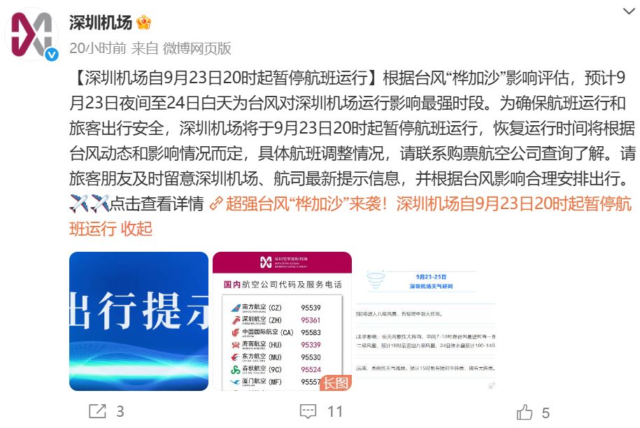 9月22日,深圳机场发文称,据台风“桦加沙”影响评估,预计9月23日夜间至24日白天为台风对深圳机场运行影响最强时段。为确保航班运行和旅客出行安全,深圳机场将于9月23日20时起暂停航班运行,恢复运行时间将根据台风动态和影响情况而定,具体航班调整情况,请联系购票航空公司查询了解。请旅客朋友及时留意深圳机场、航司最新提示信息,并根据台风影响合理安排出行。