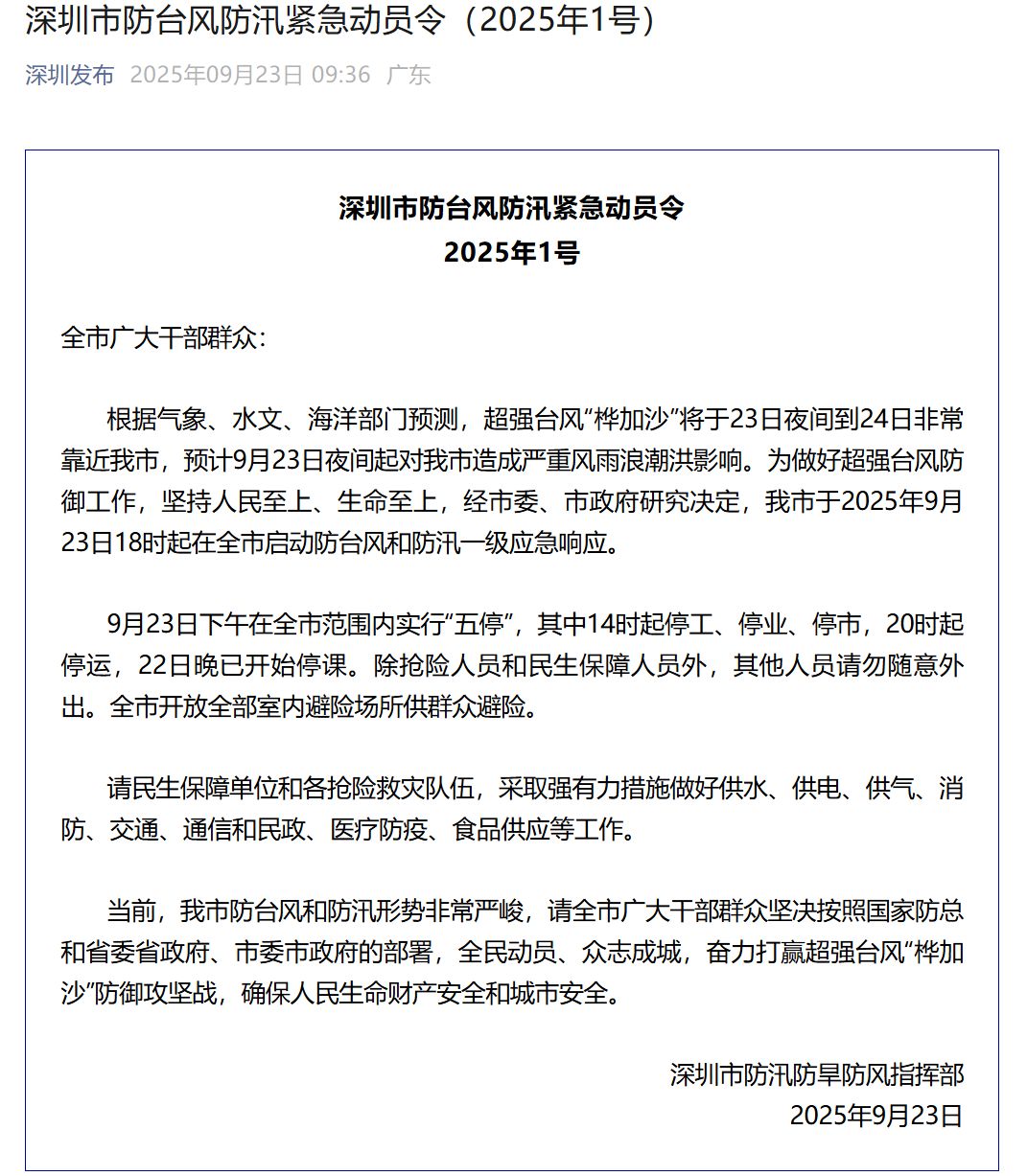 9月23日上午,深圳市防汛防旱防风指挥部发布《深圳市防台风防汛紧急动员令(2025年1号)》: