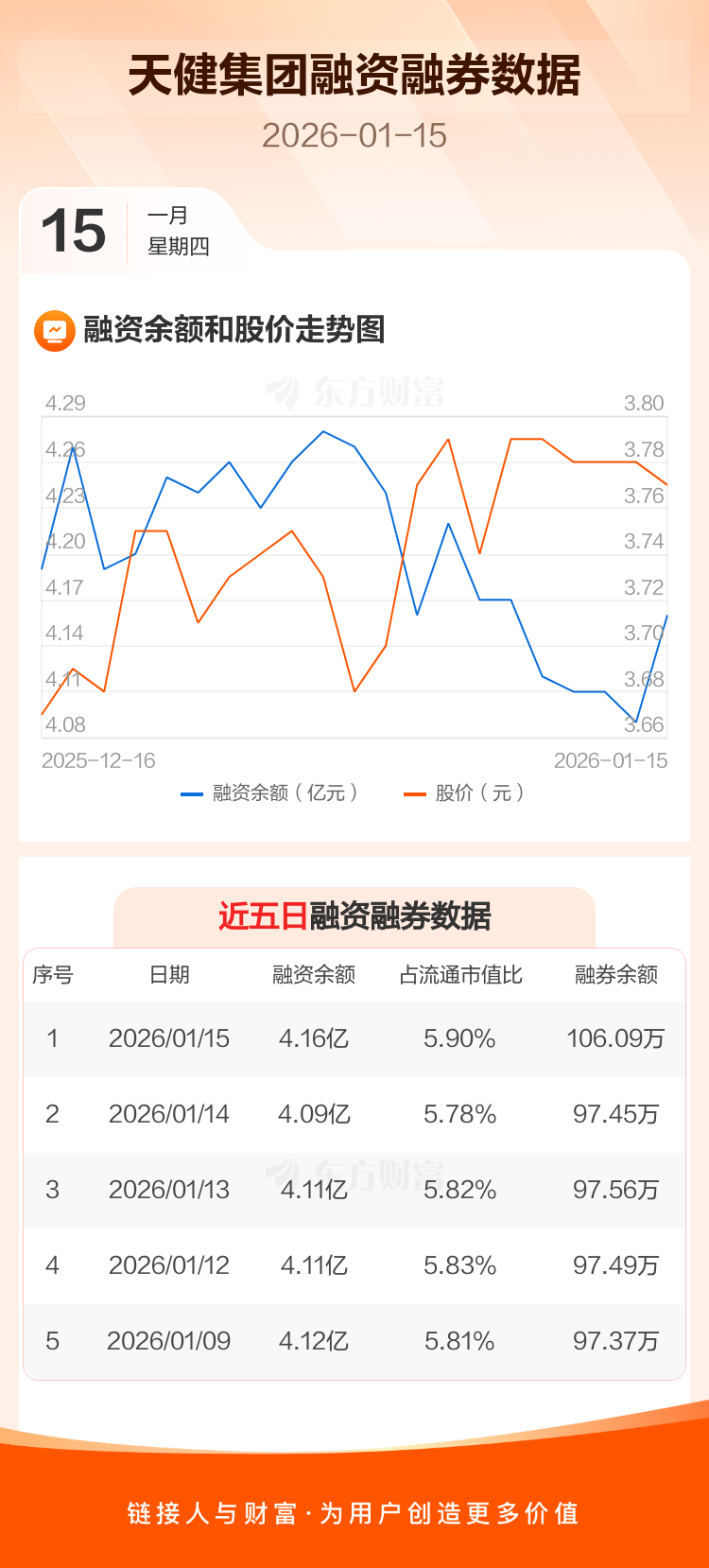 交易所最新数据显示,天健集团于2026年1月15日获融资买入1951.45万元,融资偿还1218.05万元,当日融资净买入733.4万元。目前,该股融资余额4.16亿,占流通市值比例为5.90%。