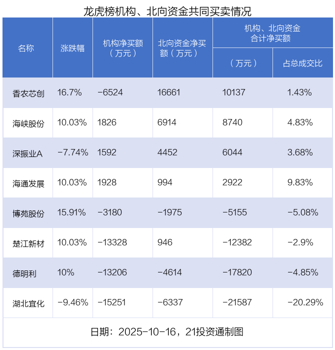 值得注意的是,机构和北向资金共同净买入了海峡股份、深振业A、海通发展等3股;共同净卖出了博苑股份、德明利、湖北宜化等3股;在香农芯创,楚江新材上出现分歧,机构净卖出香农芯创6524.23万元,北向资金净买入1.67亿元;机构净卖出楚江新材1.33亿元,北向资金净买入945.7万元。