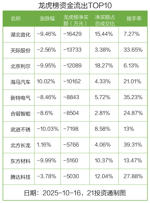 而龙虎榜中资金净流出最多的是湖北宜化(000422.SZ),被净卖出为1.64亿元,占总成交金额的15.44%。湖北宜化收盘下跌9.46%,换手率为7.27%。