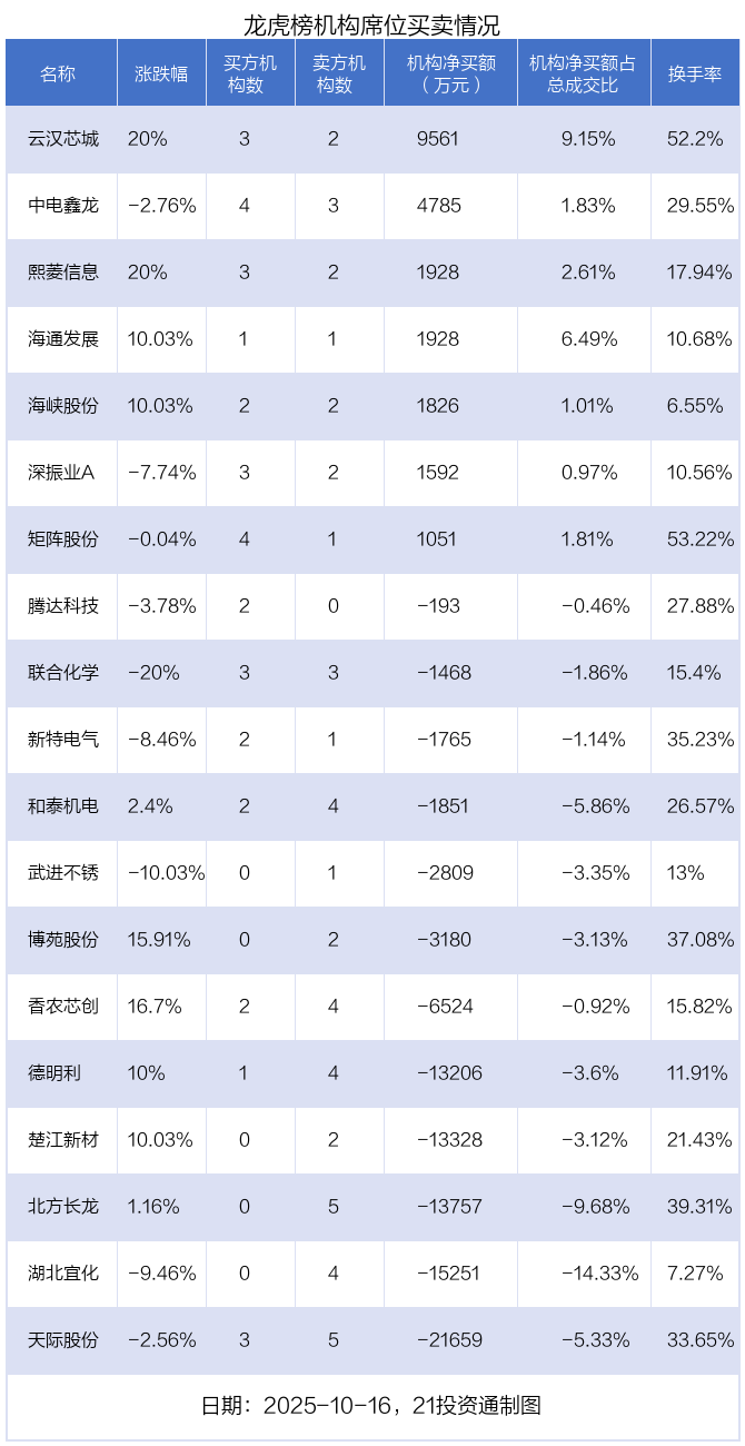 10月16日,19只个股龙虎榜出现了机构的身影,机构合计净卖出7.23亿元。具体来看,机构净买入7股,净卖出12股。
