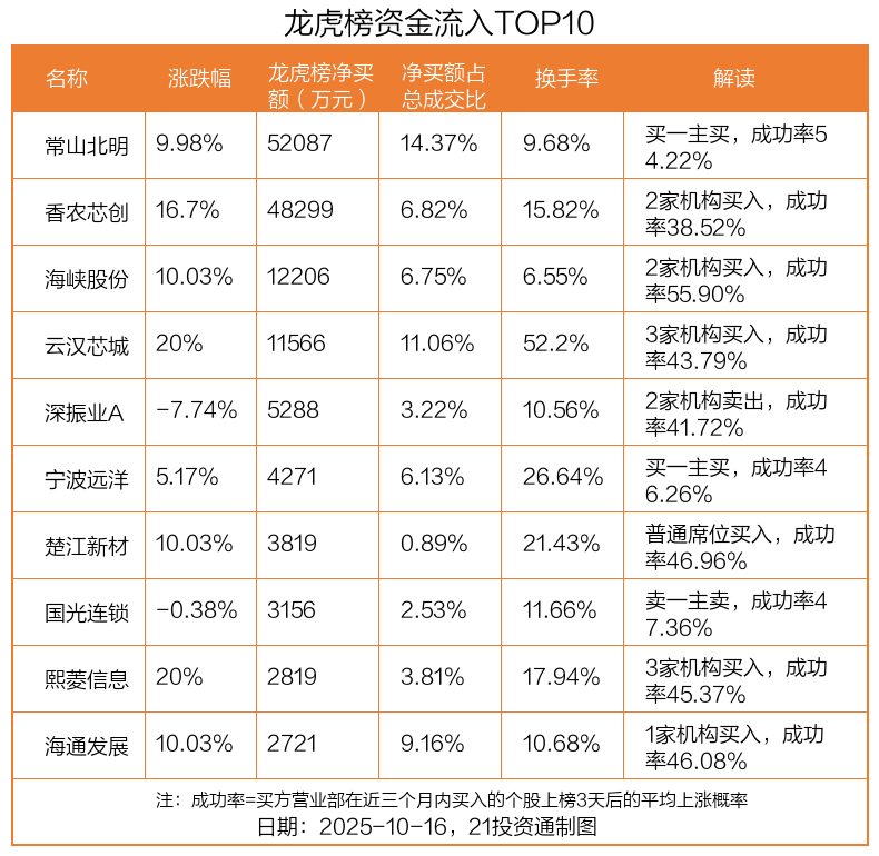 10月16日,上证指数上涨0.1%,深证成指下跌0.25%,创业板指上涨0.38%。盘后龙虎榜数据显示,共有42只个股因当日异动登上龙虎榜,资金净流入最多的是常山北明(000158.SZ),达5.21亿元。