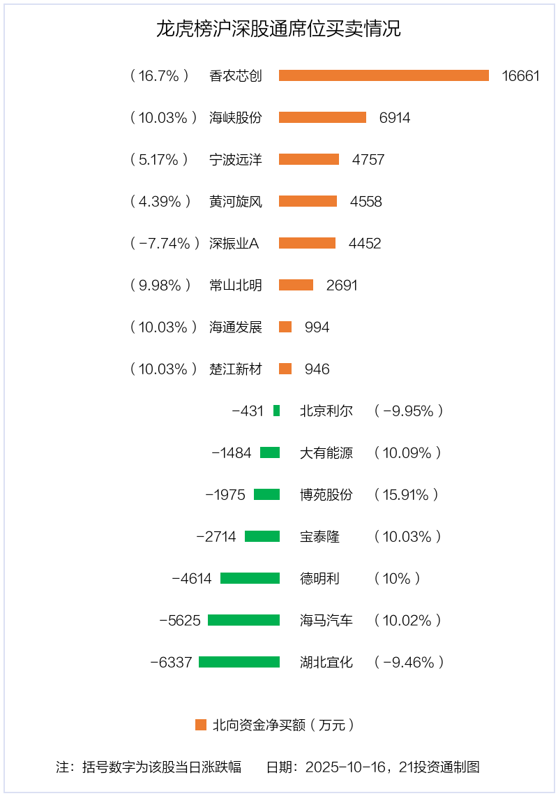 10月16日,北向资金参与龙虎榜中的个股共有15只,合计净买入1.88亿元。其中沪股通净买入3 股,净卖出2 股,合计净买入6111.57万元;深股通净买入5 股,净卖出5 股,合计净买入1.27亿元。